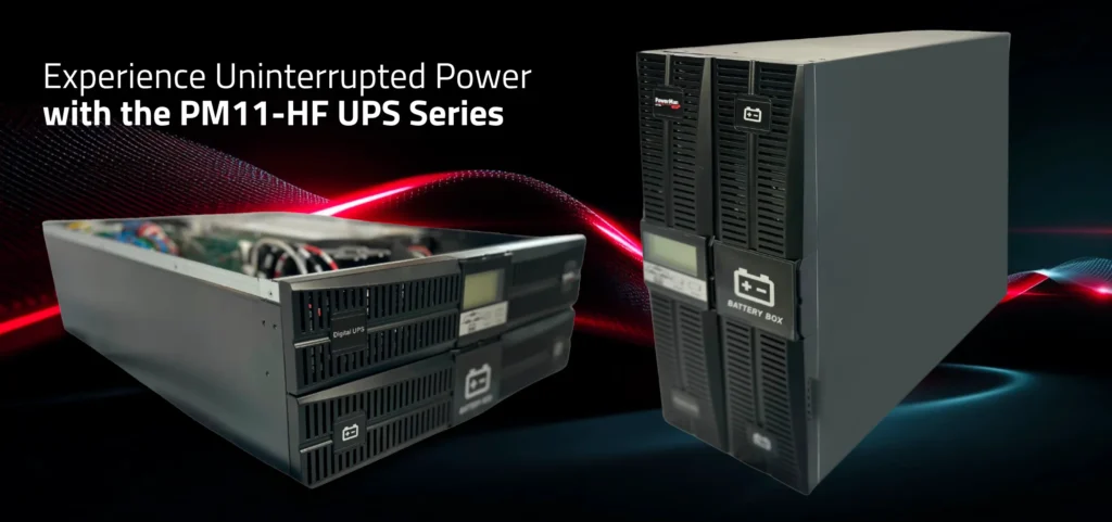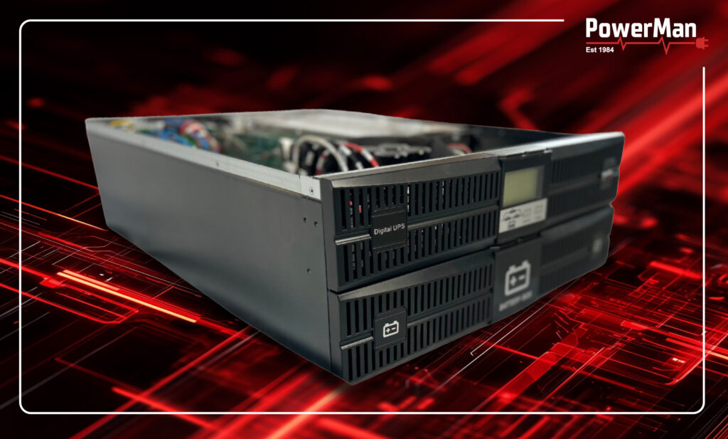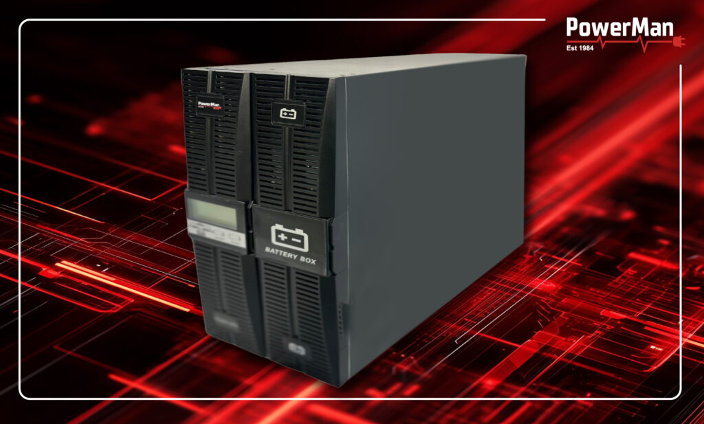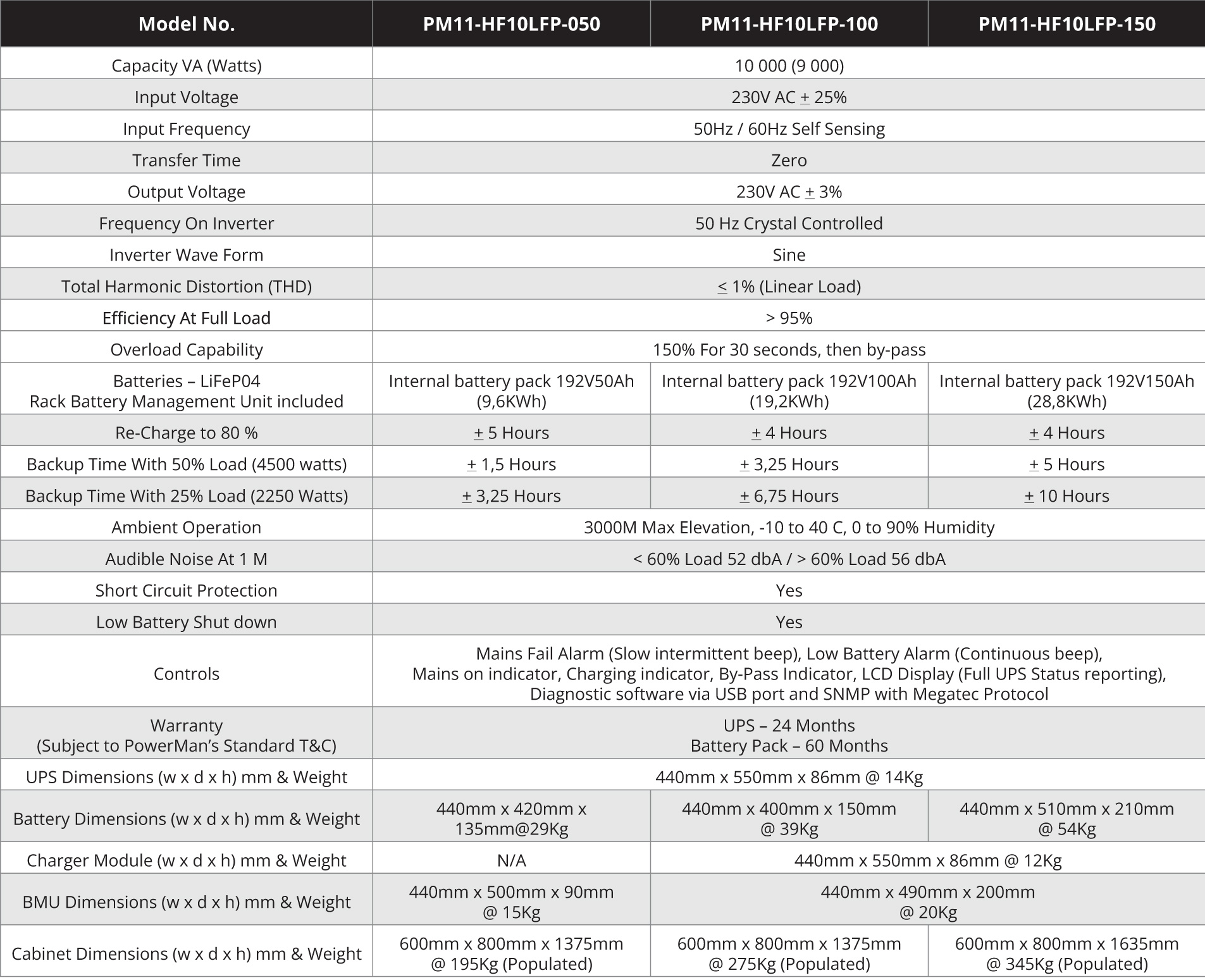 The UPS is equipped with a 10A charger (2,2KW) on the smaller machine, and an additional 5KW battery charger on the units