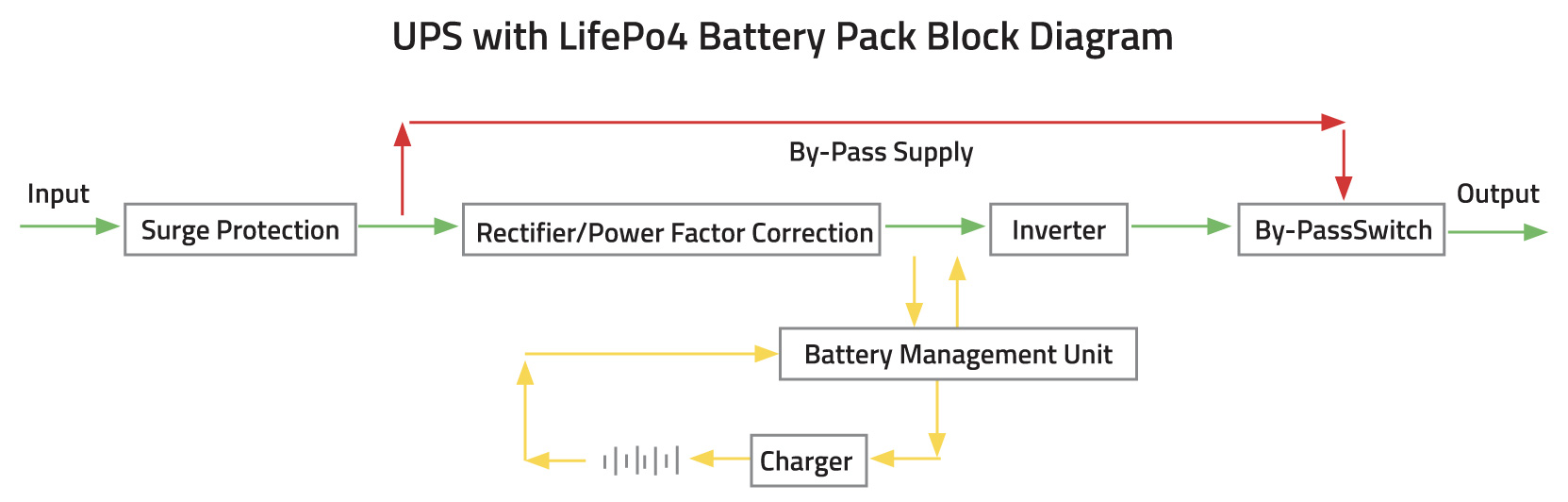 The incoming mains supply is converted to DC, which is used to charge the batteries and, via the inverter, is converted back