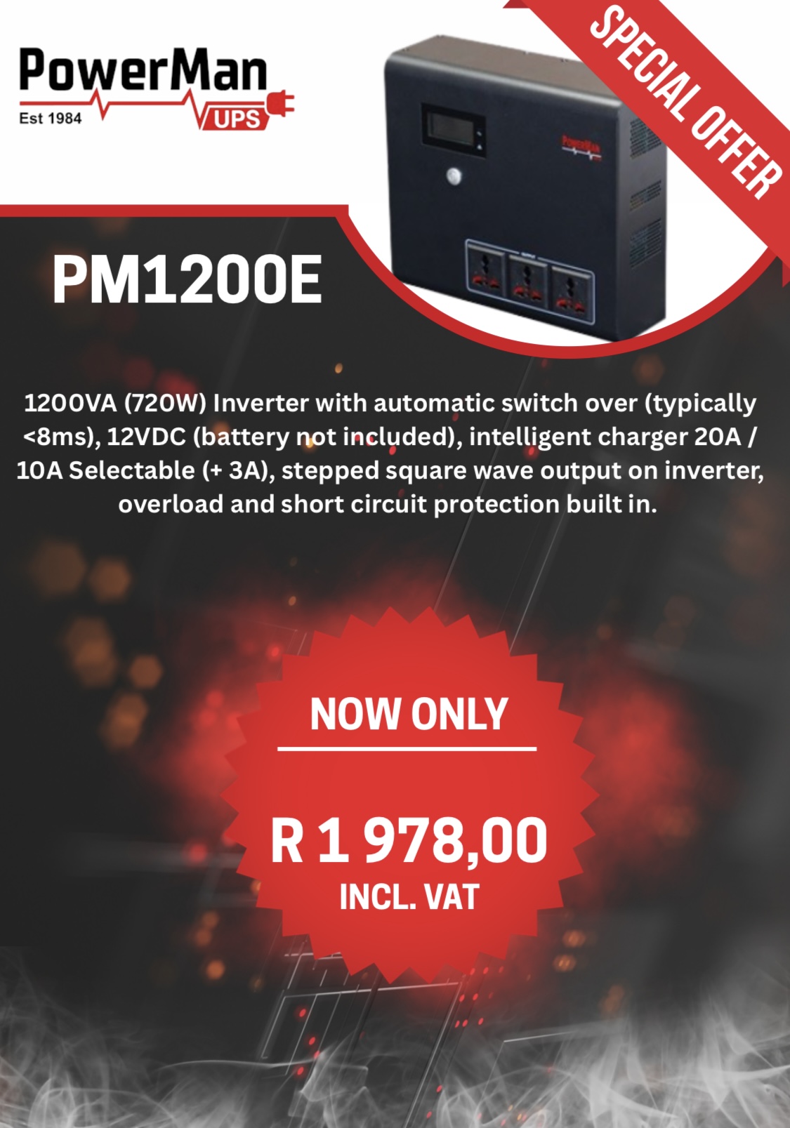 This 1200VA UPS is a cost effective, entry level UPS. The unit is ultra light and compact and can be connected to a single 12V lead-acid battery to generate a 220V output with a stepped square wave that will run most equipment (we do not recommend motors are run from these units). The unit has a built in 20 Amp charger, and if left plugged in with a battery connected will switch automatically to inverter power once the mains fails. It does not require input mains to start and can be used as a straight forward inverter.